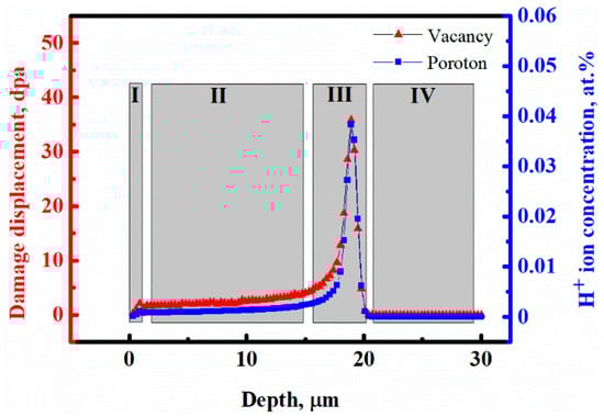 SRIM 2008 simulation of the damage zone and implanted protons distribution: region I at the surface; region II, uniform damage; region III, maximum damage; and IV, unirradiated region along the sample depth.
