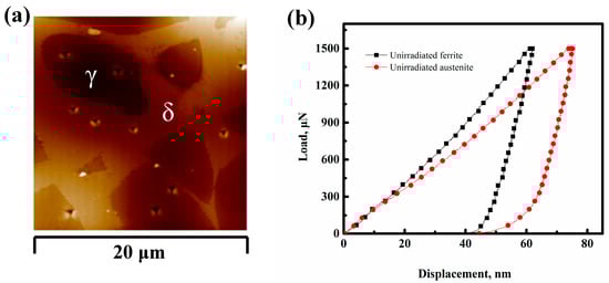 Figure 2a shows the unirradiated δ-ferrite and austenite topography of the 308L steel measured by SPM. It is seen that the δ-ferrite phase has a much smaller size than the γ-austenite phase and the indentation point could be at the boundary of the two phases due to the thermal drift. In order to avoid thermal drift effects, at least five indentations were performed to calculate the average hardness of each phase. Figure 2b shows representative indentation load-displacement curves of the two unirradiated phases. The hardness of δ-ferrite was higher than austenite at the same maximum load of 1500 μN since austenite had larger indentation depth for the same maximum load []. The average hardness for each phase is: unirradiated δ-ferrite 5.62 ± 0.34 GPa and unirradiated austenite 4.09 ± 0.23 GPa.