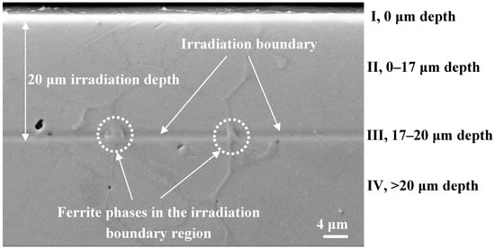 Figure 3 shows the cross-sectional SEM image of the irradiated sample after colloidal silica slurry polishing. A clear boundary was found in the irradiated and unirradiated regions after polishing with colloidal silica slurry. This line is the irradiation boundary (region III). In addition, the δ-ferrite phase was stretched across the sagged austenite phase in the irradiation boundary after polishing. This result indicated that the δ-ferrite phase was harder than the austenite in this region, also confirmed by the nanoindentation hardness measurements: δ-ferrite 6.8 ± 0.40 GPa > austenite 2.78 ± 0.08 GPa. The austenite in the boundary region III has the lowest hardness. The δ-ferrite in the boundary has the maximum hardness compared with any other region.