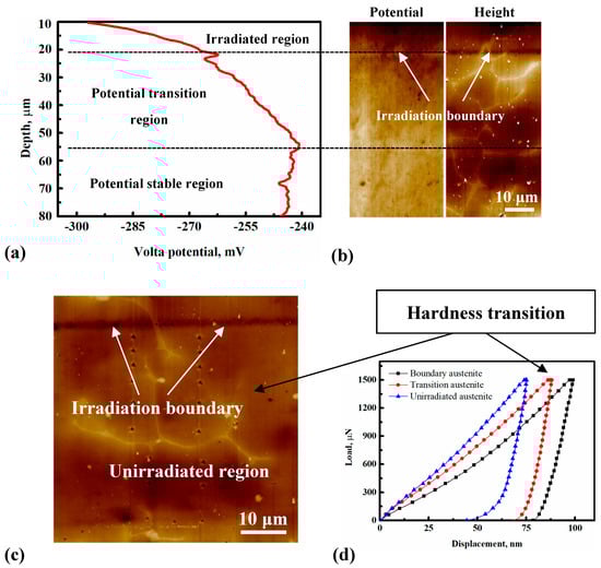 In this paper, 308L stainless steel has been studied. 308L stainless steel is used as a welding material in the primary loop of pressurized water reactors because it exhibits enhanced corrosion resistance due to its duplex phase structure [,]. Nanoindentation was used to investigate hardening of austenite and δ-ferrite caused by proton irradiation. Surface, uniform, maximum damage, and unirradiated regions along the depth direction of the irradiated sample were used for hardness testing. In addition, the transition region of protons was directly measured by SKPFM in the unirradiated region past the irradiated depth. Thus, the specific depth of the transition region was obtained.