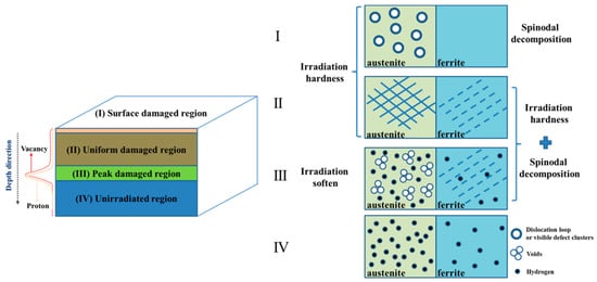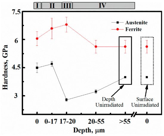The hardness of the austenite has a transition between the maximum damage region III and unirradiated region IV in the cross-section. However, the hardness of δ-ferrite has not exhibited the same results, as shown in Figure 5. It was deduced that the transition region was formed by the influence of the sunken austenite in the maximum damage region III. When the H+ ions were concentrated in the maximum damage region III, a region exists where the H+ ion concentration declines from this region to the unirradiated region IV. Since the austenite phase could dissolve more hydrogen, and the size of the austenite phase is larger than δ-ferrite, the austenite phase provides a favorable channel for the transmission of hydrogen []. It was also found that when materials were irradiated by protons, the depth affected by protons was deeper than the SRIM simulation curves of implanted protons due to many more voids formed as channels for protons transmission [].