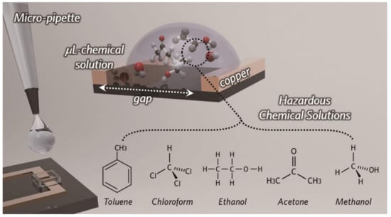 Water-based binary mixture chemical components were prepared by mixing deionized water (DI water) with solution-state chemicals such as toluene, chloroform, ethanol, acetone, and methanol with a purity of 99.5% or higher. To control the exact concentration and the precise amount of chemicals, a micropipette was used to extract DI water and chemicals. For the calculation of concentration, volume percent (v/v % chemical) was used. For example, in order to get 100 mL acetone chemical components with 20% concentration, 20 mL of acetone solution was dissolved in 80 mL DI water solution.