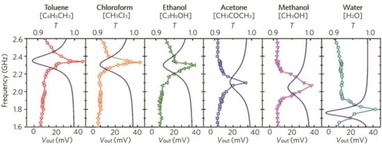 To determine how effectively the chemical substance at the SRR gap affected the spectral resonance of our metamaterial sensor, we simulated the transmission spectra of the metamaterial sensor for various chemical substances with different dielectric constants, and confirmed that the resonance frequency of transmission of the metamaterial sensor was shifted by the use of different species of chemical components having different dielectric constants as shown in Figure 3. To verify the simulation results, we filled the chemical channel of the metamaterial sensor with various chemical substances such as toluene (εt = 2.38) [], chloroform (εc = 4.81) [], ethanol (εe = 9) [], acetone (εa = 21) [], methanol (εm = 33.1) [], and water (εw = 79.5) [], and measured the output voltage (Vout) of the metamaterial sensor in the frequency domain. To measure the spectral resonance properties of the energy-harvesting metamaterial sensor, a horn antenna was connected to the signal generator to generate an incident electromagnetic wave and the metamaterial sensor was placed at a distance of 10 cm from the horn antenna. Then, spectral output voltages and resonance properties [,,] of the proposed metamaterial sensor were measured for different frequencies of the incident wave ranging from 1.8 GHz to 2.7 GHz and all of the measurement system was surrounded by anechoic materials. As shown in Figure 3, the measured output voltage showed distinct resonance frequency shifts for the various chemical components as confirmed by the simulation results. When toluene, chloroform, ethanol, acetone, methanol, and water were captured at the chemical channel, the resonance peak of the metamaterial sensor was shifted to 2.32, 2.28, 2.20, 2.08, 1.97, and 1.78 GHz, respectively.
