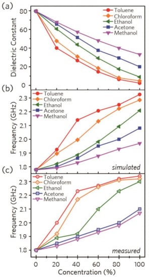 To investigate the chemical sensing properties of our proposed system, we experimentally evaluated various chemical mixtures, as shown in Figure 4. As the effective dielectric constant for chemical mixtures can be calculated from the Braggman Equation [], we plotted the calculated effective dielectric constant for binary chemical mixtures, as shown in Figure 4a. Owing to the discrepancy of the dielectric constant between water and chemical mixtures, the effective dielectric constants can be varied by changing the chemical mixture ratios and concentrations. Based on the calculated effective dielectric constants, we performed a simulation to observe the change in the resonance frequency and confirmed that the resonance frequency shifted sensitively as the concentration changed. An experiment was performed to demonstrate this, and results similar to the simulation results were obtained. Therefore, as shown in Figure 4b,c, the simulated and measured resonance frequencies of the metamaterial sensor were gradually blue-shifted in accordance with the increase in the chemical concentration in the water-based binary mixtures.