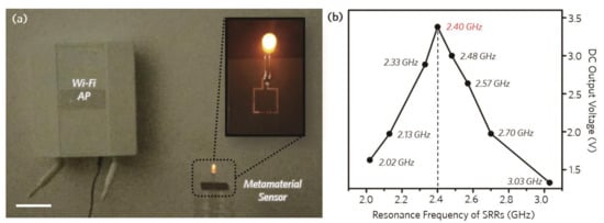 Figure 5. Wi-Fi energy-harvesting sensor system. (a) Photograph of the experimental setup for the Wi-Fi energy-harvesting sensor sys-tem. The inset shows the energy-harvesting sensor connected to an LED. (scale bar: 5 cm) (b) Measured DC output voltage of the Wi-Fi harvesting metamaterials with different resonance frequencies.