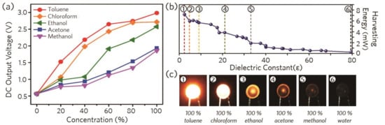 Figure 6. Experimental results for various chemical mixtures. (a) Measured DC output voltage of the Wi-Fi harvesting sensor for various concentrations of the chemical mixtures. (b) Measured harvesting energy and (c) corresponding brightness of the sensor for different dielectric constants of the chemical mixtures.