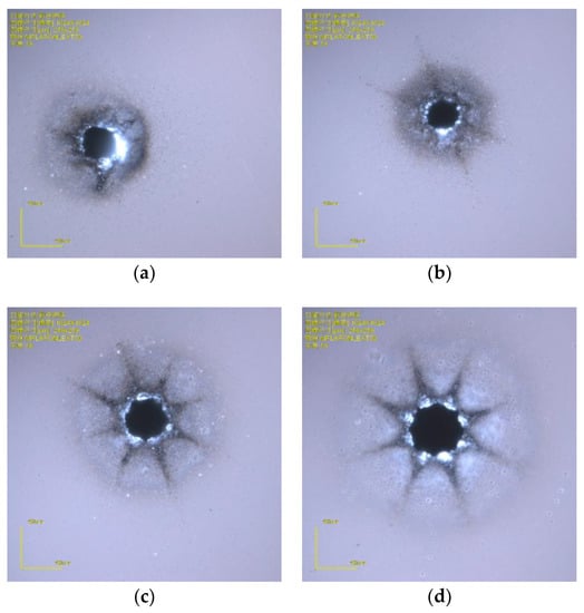 Figure 1. Via holes with different laser path diameters (a) 40-μm path diameter with 37.9-μm exit; (b) 50-μm path diameter with 49.6-μm exit; (c) 60-μm path diameter with 58.1-μm exit; and (d) 70-μm diameter with 67.7-μm exit.