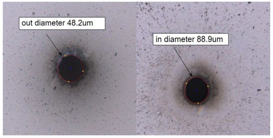 As can be seen, a hole with a diameter less than 40 μm is difficult to drill through. Due to reflections of energy on the sidewalls, the laser cannot reach the bottom of the hole. Only the scan path circle with a diameter more than 50 μm can be drilled thoroughly. The holes with a path diameter of 50 μm are not very irregular, but acceptable, which can be used in MEMS packaging. Holes with path diameters more than 50 μm can be regular and better.