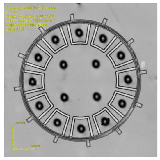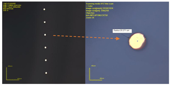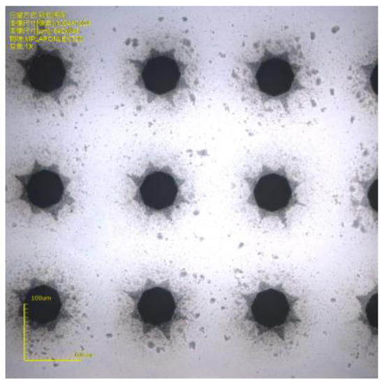 In order to verify the density of drilling, the spacing of holes’ centers was set as 200 μm, and the drilling process was achieved with good effect, as shown in Figure 3. We drew 90 circles with diameters of 50 μm within 20 × 20 mm2. Drilled with the optimized process, the drilling time was 7 min and 4 s, and it cost about 9 h and 58 min for drilling 4874 via holes on a four-inch Pyrex 7740 wafer.