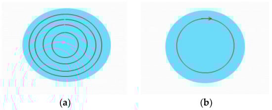Next, an experiment on 500-μm thick Pyrex 7740 glass was made. At first, we used a circular path as the drilling path. However, we could not achieve drilling with a completed hole on the back side, no matter how we adjusted the circular path and the layer thickness. Therefore, we chose the concentric circles as the laser path on each layer. Then, after optimizing the parameters, we found that setting the spacing of the concentric circles to 4–6 μm can ensure efficient glass drilling of each layer. The circular path and concentric circular path are shown in Figure 4. Additionally, the step depth is 80 μm and the step time is 25.
