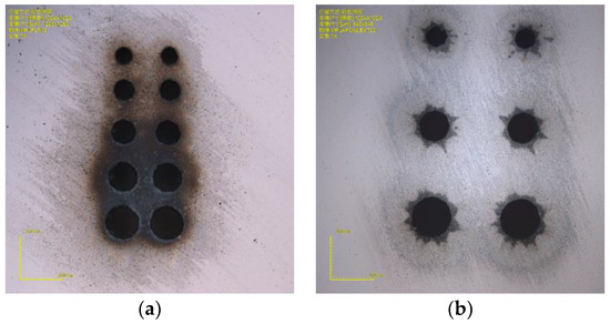 The efficiency of the drilling is dependent on the scan path circle diameter, the scan times, and the step times. For a smaller diameter, fewer scan times and step times means less drilling time. Eight holes with diameters of 40 μm, 45 μm, 50 μm, 55 μm, 60 μm, 70 μm, 80 μm, and 90 μm are drawn in a line with a center distance of 0.5 mm, and the process parameters are gradually reduced to improve the efficiency of the drilling. When the scan times is 4, the step depth was 80 μm, the step time was 12, and the process time was 58 s. However, holes whose scan path diameter is from 45 to 55 μm are irregular circles, and the hole whose scan path diameter is 40 μm gets partl of the way through, as shown in Figure 1a. To improve the hole quality, a reasonable condition was that the scan time is set to 5, the step depth was set to 80 μm, the step time was set to 15, and the process time was 1 min and 29 s. The results are shown in Figure 1.