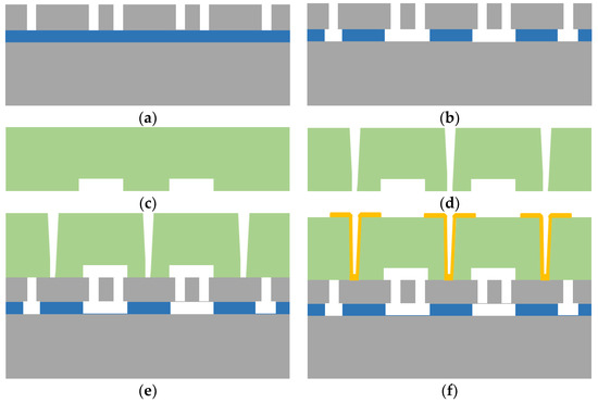 Figure 7. Fabrication process flow of a MEMS device with TGV: (a) Structure etch; (b) HF release; (c) space etch; (d) TGV drilling; (e) anodic bonding; and (f) patterned metal deposition.
