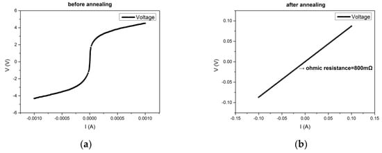 Figure 10. The voltage-current testing results using B1500A (a) before annealing, and (b) after annealing.