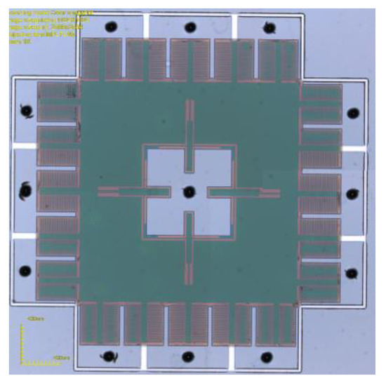 The glass after drilling was used for MEMS device packaging as the above process, then the packaging of a ring-type MEMS gyroscope and the comb micro-accelerometer were achieved, respectively. Figure 11 is the ring-type gyroscope packaged by TGV and Figure 12 shows the comb accelerometer packaged by TGV.