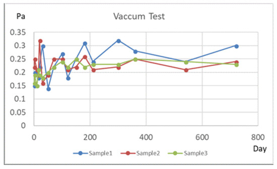 In the experiments, when encapsulating the gyroscope, the Ti and Au were sputtered as a getter, then activated at 400 °C for 1.5 h in the bonding process. Through long-term testing, the vacuum sealing chamber of the MEMS gyroscope using the getter has a stable vacuum. Its vacuum degree maintains under 1 Pa for more than two years. There are no significant changes, as shown in Figure 13.