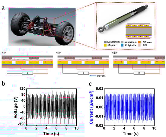 (a) Schematic structure and triboelectric regenerative suspension application and the working mechanism of a suspension-type free-standing mode triboelectric generator (STEG); (b) the output voltage and (c) short-circuit current according to the reciprocating movement of the outer cylinder with a displacement of 50 mm and speed of 100 mm/s.