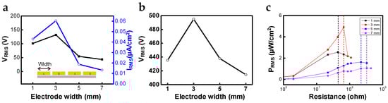 In addition, we determined that each STEG with electrode widths of 1, 3, 5, and 7 mm had different optimum resistances of 44 MΩ, 66 MΩ, 220 MΩ, and 330 MΩ, respectively, as depicted in Figure 2c. As a result, the STEG with an electrode width of 3 mm could generate 4.90 μW/cm2 at 66 MΩ. Electrical impedance of the capacitor was inversely proportional to the frequency and capacitance [12,21]. As the electrode width increased, it takes more time for a contacting part of the outer cylinder to move from electrode A to B; as such, the frequency decreased at the same speed when the effective gap between neighboring electrodes increased. Therefore, the optimum electric impedance of STEG increased as a function of electrode width.