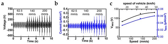Output performance evaluation versus the different speeds of outer cylinder: (a) output voltage and (b) short-circuit current with speeds of 62.5, 140, 200 mm/s, respectively; (c) output voltage and short-circuit current in RMS value versus the speed of outer cylinder and the speed of a vehicle(expected from the speed of outer cylinder).