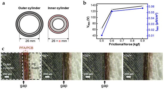 Frictional force as a parameter for output performance of STEG: (a) schematic experimental setup to control frictional force through radius control of inner cylinder; (b) short-circuit current in RMS value according to increase of frictional force; (c) observation by optical microscopy of shape-adapted deformation of PFA film with different α, (i) 0.08 mm, (ii) 0.09 mm, (iii) 0.10 mm, (iv) 0.11 mm, respectively. For α of 0.11 mm, there is no gap.