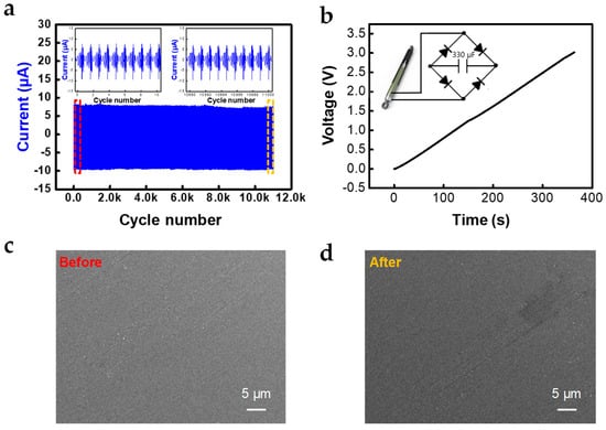 Stability of output performance and charging performance: (a) durability test for 11,000 cycles with damping force of 0.6 kgf, speed of 140 mm/s and displacement of 50 mm (inset: short-circuit current signals at the beginning and the end of durability test, respectively; red box is the beginning part and orange box is the end part); (b) charging curve for 330 μF using a rectifying bridge, with a frictional force of 0.6 kgf and speed of 200 mm/s; (c,d) SEM images of surface morphology of PFA film before and after the durability test, respectively.