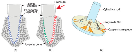 Movement of the periodontal ligaments beneath a tooth (a) in resting state and (b) with pressure applied. The green and red ligaments indicate compressed and stressed states, respectively. (c) Schematic image of the tooth-inspired tactile sensor.