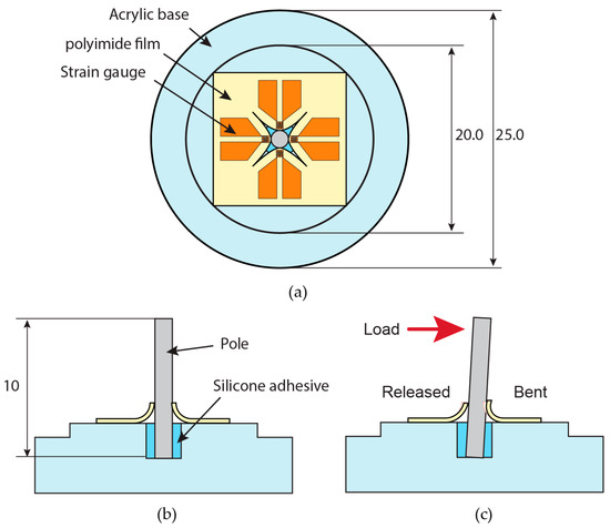 (a) Design of the proposed device, top view (above) and (b) cross-sectional side view (below). All dimensions are in mm. (c) When the load is applied to the pole, one side of the strain gauge is released and the one on the other side is bent.