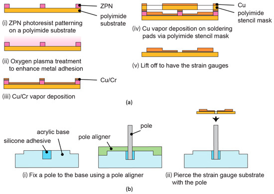 Fabrication process of the device. (a) Lift-off process for the making of the strain gauges on polyimide film and (b) the assembly process of the base, pole, and strain gauge.