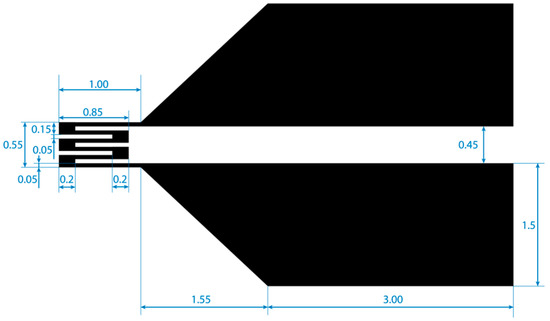 The strain gauges were made by a lift-off process. The dimension of the strain gauges is shown in Figure 4. First, a polyimide film with the thickness of 50 μm was set on a glass substrate with Kapton tape and the surface was cleaned with isopropyl alcohol. An appropriate amount of 100% wt hexamethyldisilazane primer (OAP, Tokyo Ohka Kogyo Co., Ltd., Tokyo, Japan) was applied to the polyimide film’s surface to ensure proper adhesion between the polyimide film and the photoresist. Next, 1 mL of ZPN 1150-90 photoresist (Zeon Corp., Tokyo, Japan) was spin-coated onto the film. The film was prebaked for 90 s on a 100 °C hotplate and then left at the room temperature to be cooled down. A photomask for negative type photoresist was set on the photoresist film before the photoresist was exposed to ultraviolet (UV) light. After that, post-exposure bake was conducted for 60 s on a 100 °C hotplate. The film was left in a room temperature for 10 min before the development process of the photoresist was done using tetramethylammonium hydroxide solution (NMD-3 2.38%, Tokyo Ohka Kogyo Co., Ltd., Tokyo, Japan).