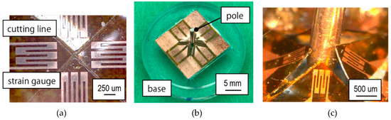 One of the notable characteristics of the sensor is its three-dimensional structure, i.e., a standing pole and bent flexible substrates on which strain gauges reside. The assembly of the structure was a challenge. We came up with the idea of fixing the pole first and then piercing through the center of the flexible substrate with the pole. The position of the pole was elastically balanced, and the contact was assured. The fabrication process is summarized in Figure 3.