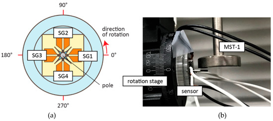 The sensitivity of the sensor was determined by the proportional coefficient between the ratio of the resistance change and the applied load or the displacement of the pole. We defined the angle of zero when the load was applied from the strain gauge SG1, as shown in Figure 6a. The experiment was conducted with the load being applied to the side of the center pole at every 15° using a micro strength tester (Micro Autograph MST-I, Shimadzu Corporation, Kyoto, Japan), as shown in Figure 6b. The output signal of the load, displacement, and voltage were recorded and analyzed.