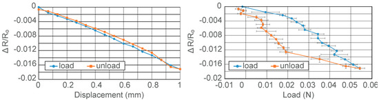 Figure 7 shows the result of the sensitivity test for the fabricated device. It shows the average and the standard deviation as the error bar among four trials, each including a load and unload cycle. As shown in Figure 7a, resistance change ratios decreased with the increase of the displacement of the cylindrical load, 5 mm from the tip of the pole. Little hysteresis was observed in the experiments. The resolution of the sensor was 0.067 mm of displacement, while sensitivity of 0.016 mm−1 for the resistance change per 1 mm displacement was obtained. Figure 7b shows the relationship between the applied load and the resistance change ratio. Compared to Figure 7a, increased hysteresis was observed in Figure 7b. We consider this due to the viscoelastic properties of the elastomer paste that was used as the glue at the bottom of the center pole. A resolution of 0.002 N and sensitivity of 0.313 N−1 for resistance change per 1 N load applied to the center pole was obtained. Figure 7b indicated some abnormal resistance variations at 0.03 to 0.05 N during loading, and less than 0.01 N during unloading, which was likely due to a slip between the pole and the tip of the triangular strain gauge film.