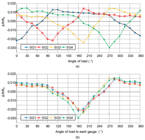 Results of the test for direction of load recognition. (a) The direction of rotation from 0° to 360° and the ratio of resistance change for each degrees of the same load applied. The results were replotted for 0° defined as the opposite of each strain gauge as shown in (b) the replotted graph.