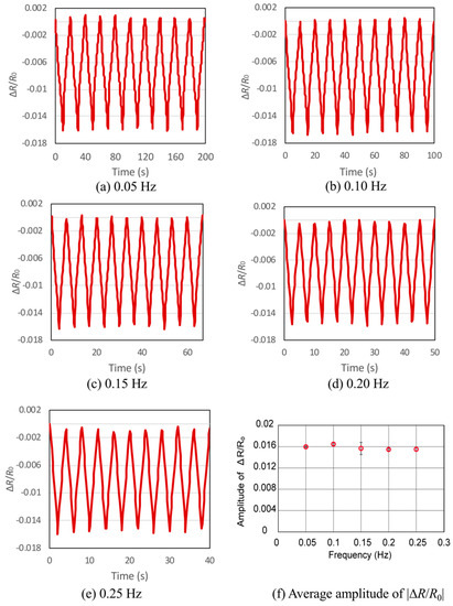 Results for loading repeatability test for cyclic loading frequency of (a) 0.05 Hz, (b) 0.10 Hz, (c) 0.15 Hz, (d) 0.20 Hz, (e) 0.25 Hz, and (f) the absolute values of average amplitude of resistance change ratios for all frequencies. The amplitudes of resistance change ratio were consistent for the loading frequency of 0.05 Hz to 0.25 Hz.