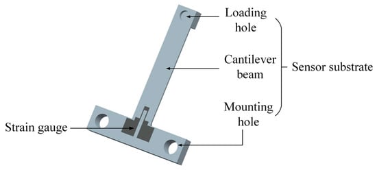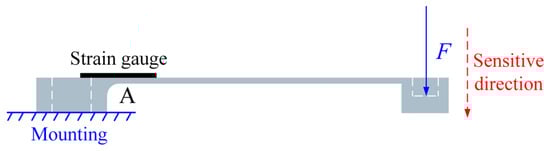 As shown in Figure 3, when the force is applied at the loading hole, the cantilever beam deforms and a maximal strain occurs near the fixed end of the cantilever beam, i.e., position A. The function of the strain gauge printed at position A converts the strain change to a resistance variation. The strain gauge is thin and the adherence between the strain gauge and the cantilever beam is perfect. In those conditions, the strain of the strain gauge is approximately equal to the strain of the cantilever beam [].