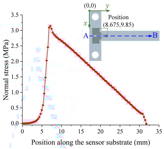 The normal stress distribution along the path A to B on the sensor substrate and the position of the strain gauge.
