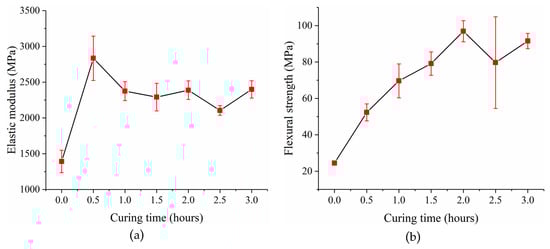 (a) The elastic modulus of the post-cured resin versus curing time; (b) the flexural strength of the post-cured resin versus curing time.