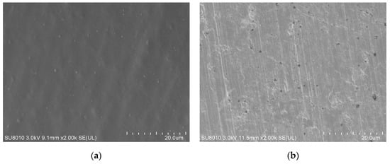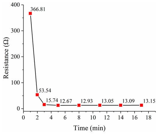 The PEDOT/PSS films dried at the room temperature for 24 h and dried in an air convection oven at 120 °C for 15 min were observed using a scanning electron microscope SU-8010 from HITACHI (Tokyo, Japan). It can be seen that the heat drying process can make the PEDOT/PSS film flatter and denser, as shown in Figure 8. The effect of the heat drying process on the PEDOT/PSS film resistance was also investigated, as shown in Figure 9. The resistance of the PEDOT/PSS film decreased rapidly when heat drying begins and tended to be stable after 8 min.