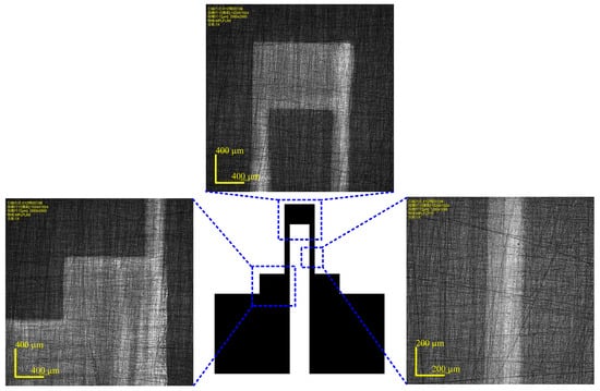 In order to study the morphology of the printed strain gauge, the printed strain gauge with three layers of PEDOT/PSS on the sensor substrate was observed using a confocal laser scanning microscope LEXT OLS4000 from Olympus (Tokyo, Japan), as shown in Figure 10. The strain gauge has a good appearance and a clear edge. The width of the strain gauge’s longitudinal branches was also measured, which was 248.106 ± 3.437 µm. The measured width is larger than the width in the design diagram. This was caused by the expansion of the PEDOT/PSS ink marks on the sensor substrate, which will deteriorate the dimensional accuracy.