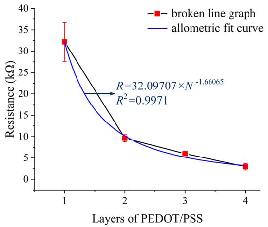 The resistance of the strain gauge is an essential parameter of the strain gauge type sensor, so the strain gauge printed on the sensor substrate was also characterized. The relationship between the resistance of the strain gauge and the count of layers of PEDOT/PSS was investigated. Measurements were done using samples with 1, 2, 3, and 4 layers of PEDOT/PSS, respectively. The resistance values were measured using a FLUKE 8846A 6-1/2 digital precision multimeter (Fluke Corporation, Everett, WA, USA) at 21.7 °C, 56.0% RH. There were 20 samples (5 samples for each group) and each sample was measured three times. The experiment results are listed in Table 3. As shown in Figure 11, the resistance of the strain gauges is decreased from 32.15253 ± 3.49692 kΩ to 2.98283 ± 0.59104 kΩ as the count of layers of PEDOT/PSS was increased from 1 to 4. There is an allometric relationship between the resistance and the count of the printed layers, which is not a strict inverse relationship. Also, with the increase of the layers, the standard deviation of the resistance decreased. Therefore, the count of layers should be large enough to achieve a strain gauge with small, stable resistance. However, there was a short circuit phenomenon occurring on the strain gauge with 4 layers of PEDOT/PSS because of the expansion of the PEDOT/PSS ink marks on the sensor substrate, which deteriorates the resistance consistency. Taking all these things into consideration, the strain gauge was printed with 3 layers of PEDOT/PSS to achieve a small, stable resistance.