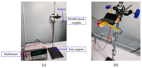 At first, an experimental setup was established to characterize the force sensor. As shown in Figure 13, the experimental setup can be divided into three parts. The iron support stand was used to clamp and hold up the force sensor. The double-hook weights were utilized to apply well-defined force on the loading hole of the force sensor, and every double-hook weight is 2 g in weight with a manufactured precision of ±1.2 mg. The multimeter (FLUKE 8846A 6-1/2, Fluke Corporation, Everett, WA, USA) was used to read out the resistance of the force sensor. The experimental setup was put on the anti-vibration platform and the force sensor was clamped horizontally in an iron clip. In the static test, the loading force was applied from 0 mN increasing to 160 mN then decreasing to 0 mN with the use of eight 2 g double-hook weights. The loading and unloading process was repeated three times and mean values of the experimental data were obtained.
