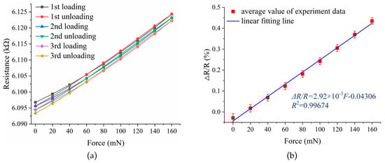 The data of the static test are recorded in Table 4, and the results of the static test are shown in Figure 14. To better understand of the force sensor performance, the performance parameters such as sensitivity, linearity, hysteresis, repeatability, and overall accuracy were calculated. Within the range 0–160 mN, a sensitivity of 2.92% N−1, a linearity error of 3.1485% FS, a hysteresis of 2.0191% FS, repeatability of 6.7243% FS, and an overall accuracy of 7.6945% FS were obtained. The linearity error and repeatability error of the force sensor is relatively large, and these were mainly induced by the intrinsic properties of the high-temperature resin, such as the creep property. Combined with the simulation analysis with theoretical calculation, the effective gauge factor of the strain gauge was obtained, which was about 0.98.