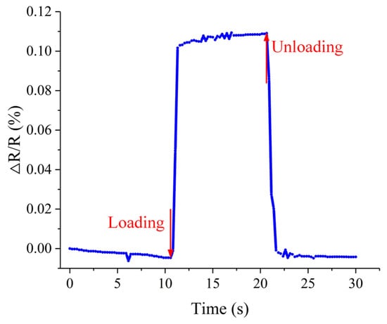 Besides the static test, the dynamic characteristics of the force sensor were also tested with the same experimental setup. The response time to a sudden increase and decrease of a force on the force sensor and the ability of the force sensor to keep a stable output under a constant force were investigated. To achieve these measurements, a 5 g double-hook weight was applied to the force sensor for a while. The whole test time was 30 s, and the loading time was about 10 s. The relative resistance variation of the force sensor under the force pulse is shown in Figure 15. The rise time was 756.1 ms the fall time was 1031.1 ms. The fall time was relatively long due to the creep property of the high-temperature resin. The fluctuation during the loading time was mainly caused by the waggle of the double-hook weight. Also, there is zero drift occurring in this test.
