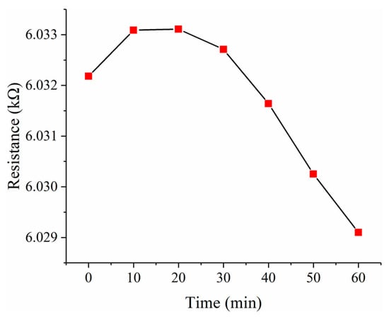 To investigate the zero drift of the force sensor, a short-term stability test was performed for one hour. The data of the short-term stability test are recorded in Table 5. As shown in Figure 16, the resistance was read every 10 min, and the resistance changes are no more than 0.004 kΩ in one hour, which is 0.0665% of the initial resistance. The minor changes of the temperature and humidity in the laboratory may contribute to the 0.004 kΩ fluctuation.