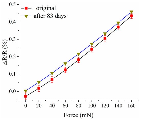 The resistance of the force sensor was measured again 80 days after the short-term stability test, and the result is 6.04316 kΩ. This may be caused by the humidity change in the laboratory, which is 48.1% RH before and 15.6% RH after. Also, the static test was conducted again after 83 days. As shown in Figure 17, the result is close to the result of the static test before, and this indicates that the long-term stability of the force sensor is good.