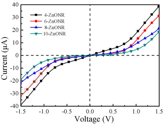 Current–voltage (I–V) curves of the n-ZnONR (n = 4, 6, 8, 10) devices.