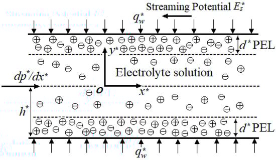 In recent years, microfluidic devices, including micro electro mechanical systems (MEMS), have been widely used in biology, chemistry, medicine, and engineering for chemical separation and thermal management of microelectronic systems [1,2,3,4,5,6,7,8]. There are many advantages of these devices, such as relatively low costs, light weights, high transport coefficients, small heat loss, etc. Currently, there are numerous types of technologies for driving and controlling microfluidics. In general, the fluid flow in nanochannels is driven by pressure, surface tension, external electric field, external magnetic field and high frequency sound wave [9,10]. Compared with other driven mechanisms, pressure driven flow in nanochannels has many applications [11,12,13] and is often utilized to obtain streaming potential. When the electrolyte solution comes into contact with the wall of nanochannels, an electric double layer (EDL) is formed due to the charge exchange between the wall surface and the electrolyte. A streaming current is produced along a flowing direction within the EDL when an electrolyte solution flows in channels under a pressure gradient. When the electrolyte solution is flowing, the net charge is gathered at downstream nanochannels. As a result, the downstream potential in nanochannels is higher than the one of the upstream. Finally, this induces a steady-state electric field, called the streaming potential, opposite to the original direction of flow. Relevant studies have indicated that, through the above process, the kinetic energy of the pressure-driven transport and chemical energy of the EDL can be converted into electrical energy [14,15,16,17,18,19,20,21]. The streaming potential phenomenon is considered as a reciprocal phenomenon of electroosmosis which represents the movement of electrolyte solution relative to a stationary charged surface due to an applied electric field [22].