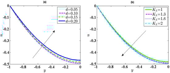 Distribution of the velocity when λ = 0.25, α = 1, ur = 0.1, R = 1. (a) Influence of d (0.05, 0.10, 0.15, 0.20) when Kλ = 1; (b) Influence of Kλ (1, 1.3, 1.6, 2) when d = 0.15.