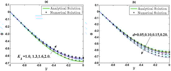 Figure 3 gives the comparison of the analytical solutions of temperature with numerical solutions obtained by using a finite difference method. The detailed algorithm can be found in Appendix B. It is shown that the analytical solutions agree well with the numerical results. It can be found from the expression of dimensionless temperature (14) that θ is related to the temperature difference (T*w−T*) between the wall of soft nanochannels and electrolyte solution. Hence, the magnitude of dimensionless temperature θ becomes larger with the temperature difference. From Figure 3, the magnitude of dimensionless temperature θ has an increasing trend far away from the wall. It can also be observed from Figure 3a that the dimensionless temperature reduces as the increasing value of Kλ. This can be interpreted by using energy balance. As a matter of fact, the velocity grows with Kλ, which can enhance thermal energy further. This is because the thermal energy is transferred from the wall of soft nanochannels to the fluid by the flowing fluid, which eventually brings about rising in local temperature of the fluid and a decrease of the wall temperature, i.e., the decreasing temperature difference. Figure 3b reflects that the dimensionless temperature curve falls as the increasing d. Similar to the above analysis, an increase of d can result in a decline of the velocity, which further weakens the thermal energy and eventually leads to an increase of the dimensionless temperature.