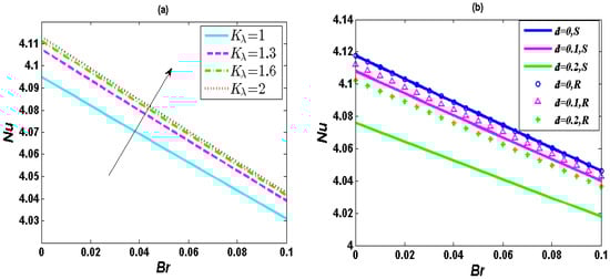 Figure 4 describes the variation of the heat transfer rate Nu with the Brinkmann number Br. It can be seen from Figure 4 that Nu decreases with increasing Br. The Br actually represents the degree of the viscous dissipation effect physically. The wall temperature is larger than the main temperature as the growing Br, i.e., the value of (T*w−T*) will become larger. According to the definition of the constant wall heat flux qw* = h′* (T*w−T*), the convective heat transfer coefficient h′* naturally falls. Hence, Nu will finally reduce. Figure 4 (a) demonstrates the heat transfer rate become larger with Kλ. The reason for this is that increasing Kλ will bring about a decrease of the nondimensional temperature, i.e., the value of (T*w−T*) will become smaller. Thus, the heat transfer rate enhances.