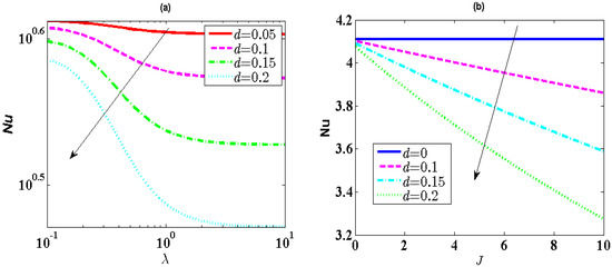 (a) The influence of d (0.05, 0.10, 0.15, 0.20) on Nu with λ (10-1–10) when Kλ = 1, R = 1, α = 1, ur = 0.1, J = 5, Br = 0.01. (b) Influence of d (0, 0.10, 0.15, 0.20) on Nu with J (0–10) when λ = 0.25, Kλ = 1, R = 1, α = 1, ur = 0.1, Br = 0.01.